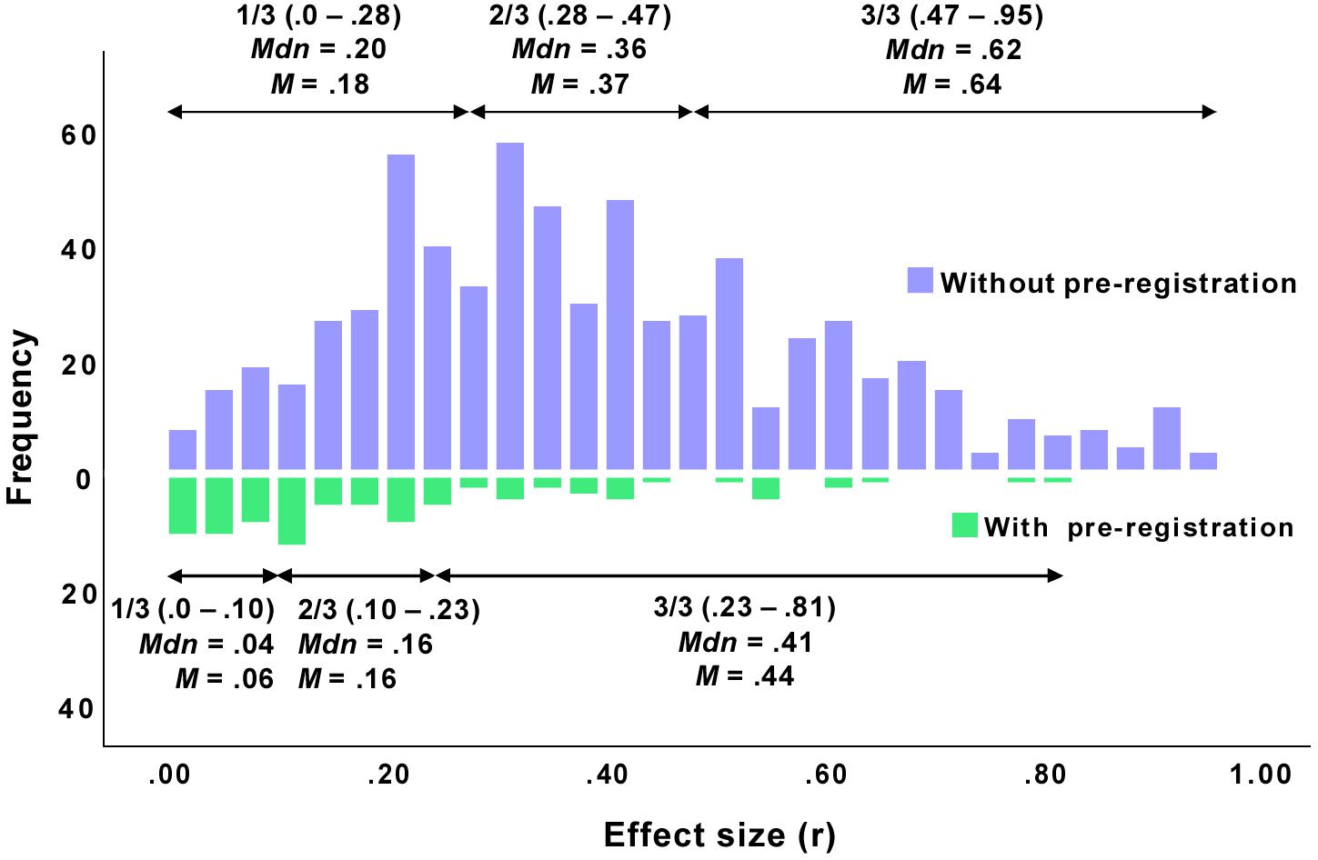 效果量依研報告次數佔比分級,無預先註冊的心理學研究傾向高估效果量。